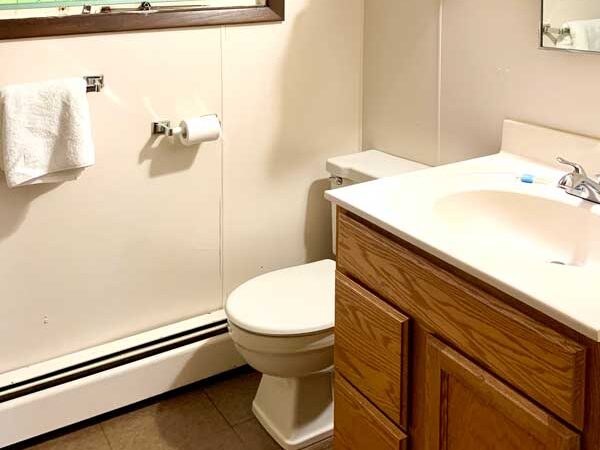 Rental home with 3 Bedrooms (2 Queen, 1 Full) and 1.5 Bathrooms. It has a small living room and a large combined kitchen and dining area with tables and chairs. It also has a basement for storage and an on-site washer and dryer.